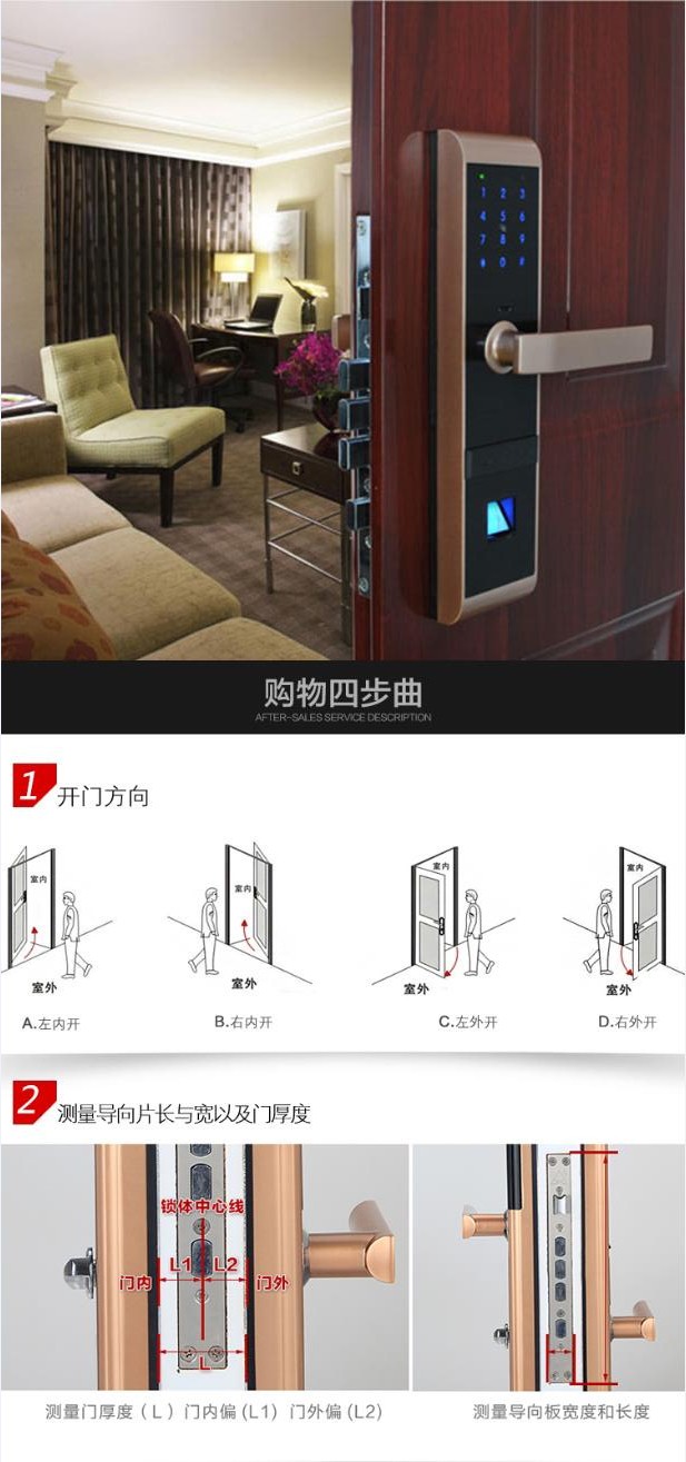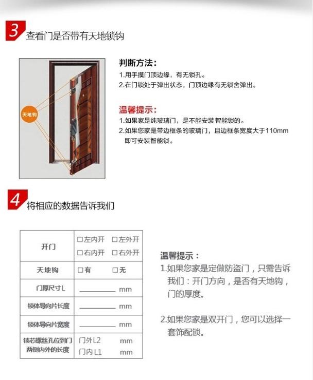 1、确认开门方向、锁体尺寸及是否挂天地勾